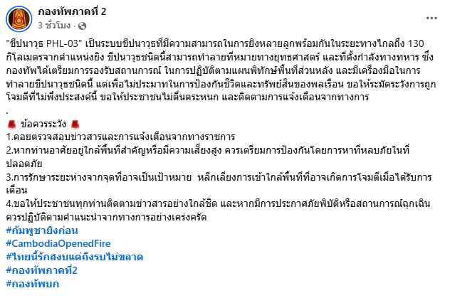เมื่อวันที่ 25 กรกฎาคม 2568 เพจทางการของกองทัพภาคที่ 2 ออกประกาศแจ้งเตือนประชาชนให้ระมัดระวังความเป็นไปได้ที่ฝ่ายกัมพูชาจะใช้ระบบจรวดหลายลำกล้อง “PHL-03” ซึ่งมีรัศมีโจมตีไกลถึง 130 กิโลเมตร โดยเล็งเป้าหมายในพื้นที่ยุทธศาสตร์ และฐานที่ตั้งทางทหารของฝ่ายไทย