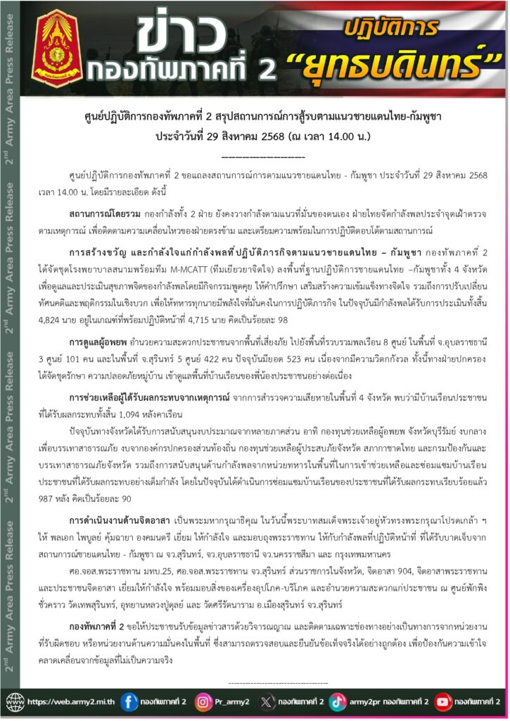 เมื่อวันที่ 29 สิงหาคม 2568 เวลา 14.00 น. ศูนย์ปฏิบัติการกองทัพภาคที่ 2 แถลงสถานการณ์ความเคลื่อนไหวตามแนวชายแดนไทย–กัมพูชา โดยระบุว่า ขณะนี้ทั้งสองฝ่ายยังคงตรึงกำลังประจำพื้นที่ของตนเองอย่างต่อเนื่อง ฝ่ายไทยจัดกำลังพลเฝ้าตรวจความเคลื่อนไหว พร้อมเตรียมการตอบโต้หากเกิดสถานการณ์ฉุกเฉิน