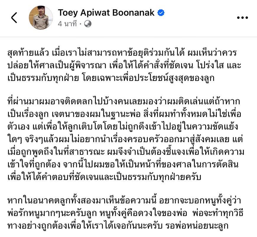 ครูเต้ยทิ้งท้ายว่า เมื่อหาข้อยุติร่วมกันไม่ได้ ก็ควรปล่อยให้ศาลเป็นผู้พิจารณา เพื่อความโปร่งใสและเป็นธรรมต่อทุกฝ่าย โดยเฉพาะเพื่อประโยชน์สูงสุดของลูก พร้อมฝากข้อความถึงลูกทั้งสองว่า