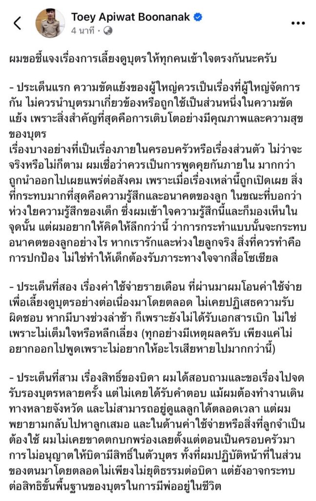 เจ้าตัวยืนยันว่า ตลอดเวลาที่ผ่านมาได้โอนค่าใช้จ่ายในการเลี้ยงดูบุตรอย่างต่อเนื่อง ไม่เคยปฏิเสธความรับผิดชอบ แต่หากบางช่วงล่าช้า เป็นเพราะขั้นตอนการเบิกจ่ายเอกสาร ไม่ใช่เพราะไม่เต็มใจ